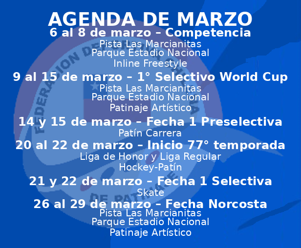Comienza el tercer mes del año y con ello las actividades del patinaje inician sus correspondientes competencias. Un panorama de lo que viene en los próximos 31 días, resumido en el siguiente recuadro.