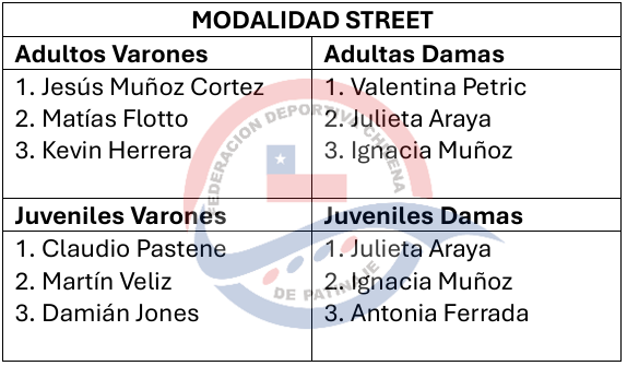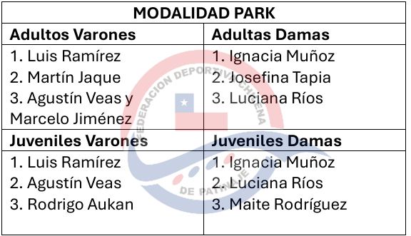 Tanto en la modalidad Park como en Street compitieron los representantes de los clubes Héroes de Maipú, Skate Vida Monos Porfiados, Club Skate Zapallar, Club Skate Espejo de Agua de La Serena y Club Deportivo Skate Vida.